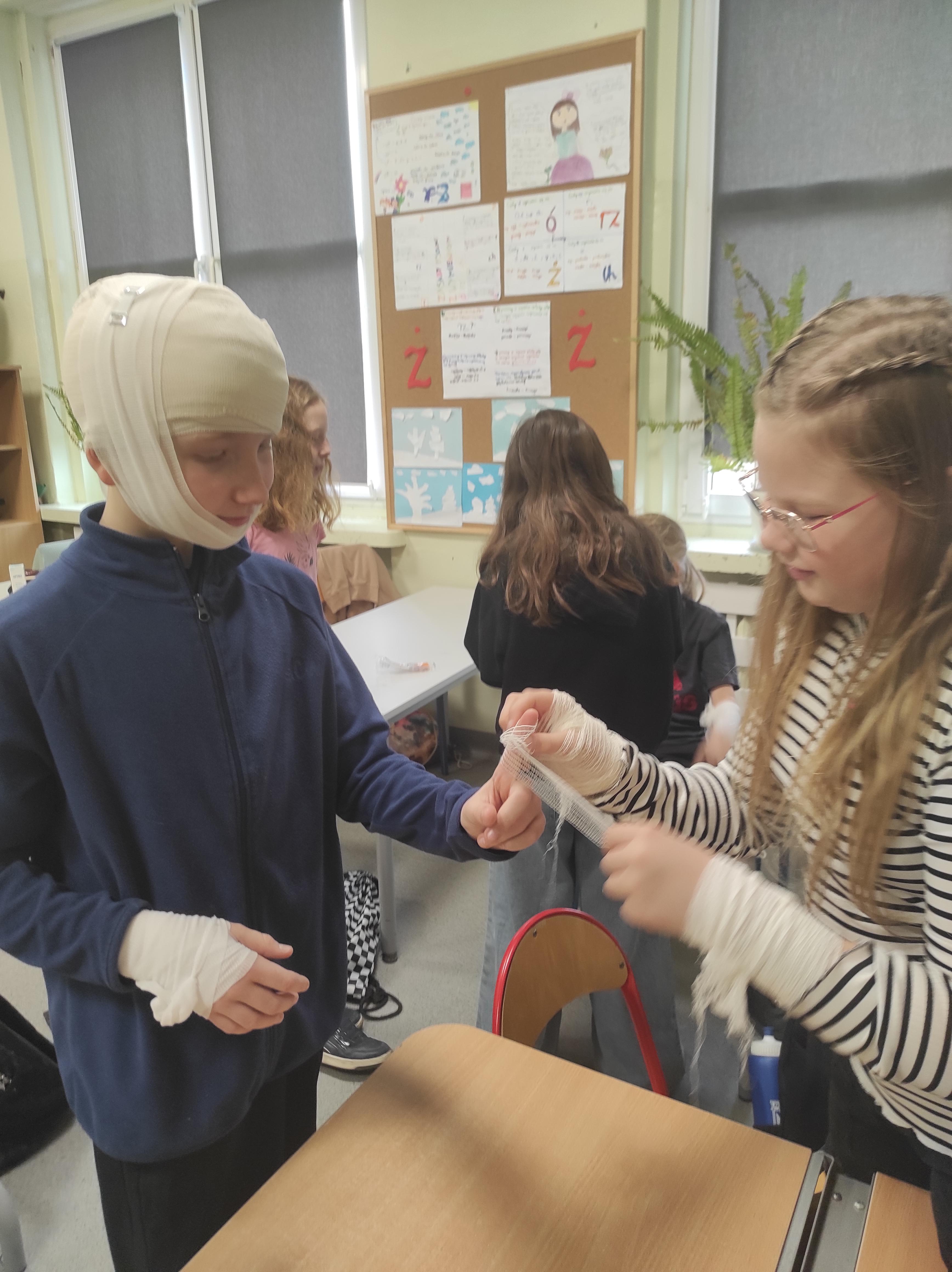 Podczas spotkania zaprezentowała uczniom różne techniki bandażowania i opatrywania ran ?.